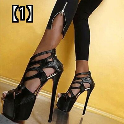 キャバ ヒール ブーツ レディース ハイヒール ピンヒール 16cm グラディエーター オープントゥ 厚底 バックファスナー おしゃれ セクシー 美脚 春夏 黒 ゴールド