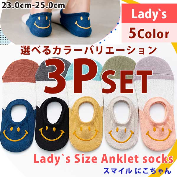 靴下セット 3P SET ソックス 靴下 にこちゃん スマイル アンクルソックス カバーソックス くるぶし レディース 23.0-25.0 5Color 綿 コットン カラフル