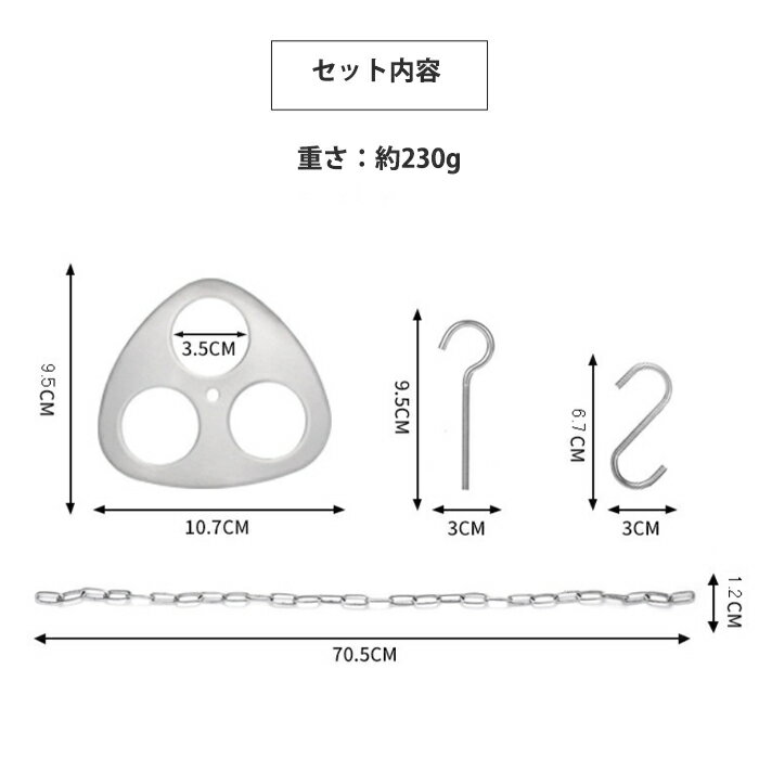 【商品詳細】 【素材】ステンレス 【サイズ】穴3.5cm 厚み2.5mm チェーンのみ70.5cm 設置して三角板下からフックまで80cm-85cm 三角板 10.7cm×9.5cm 【重量】約230g 2〜3営業日以内に発送します。