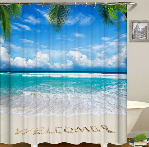 飾るだけで手軽にリゾート気分が味わえる、海がプリントされたおしゃれなシャワーカーテンです。