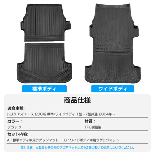 圧倒的に軽量さで車内をドレスアップにオススメ! 梱包サイズ:160サイズ、重さ:約6KG セット内容 ラゲッジマット×2PCS 取扱説明書×1枚 適合車種 ハイエース/レジアスエース KDH200/TRH200系 標準ボディ DX/スーパーGL 1型/2型/3型/4型/5型/6型 ※年式/グレード/オプション等により適合しない場合が御座います。
